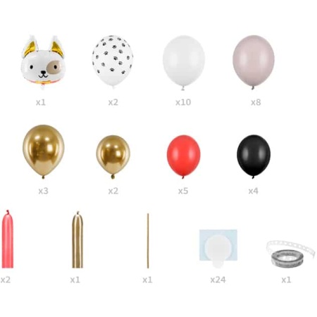 Balónová dekorácia Pes. Rozmery cca 83 x 155 cm. Balónový set obsahuje 1 ks fóliový balón pes, 34 ks latexových balónov, 4 ks modelovacie balóny, 1 ks papierová slamky, 24 ks penová páska, 2.5 m girlandová páska.