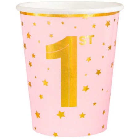 Papierové poháre 1. narodeniny, ružové s hviezdičkami, 220ml, 6ks