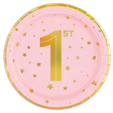 Papierové taniere 1. narodeniny, ružové s hviezdičkami, 18cm, 6ks