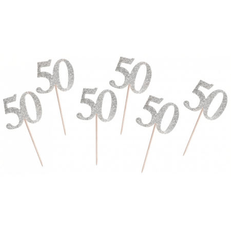 Napichovadlo 50. narodeniny strieborné s trblietkami, 6ks